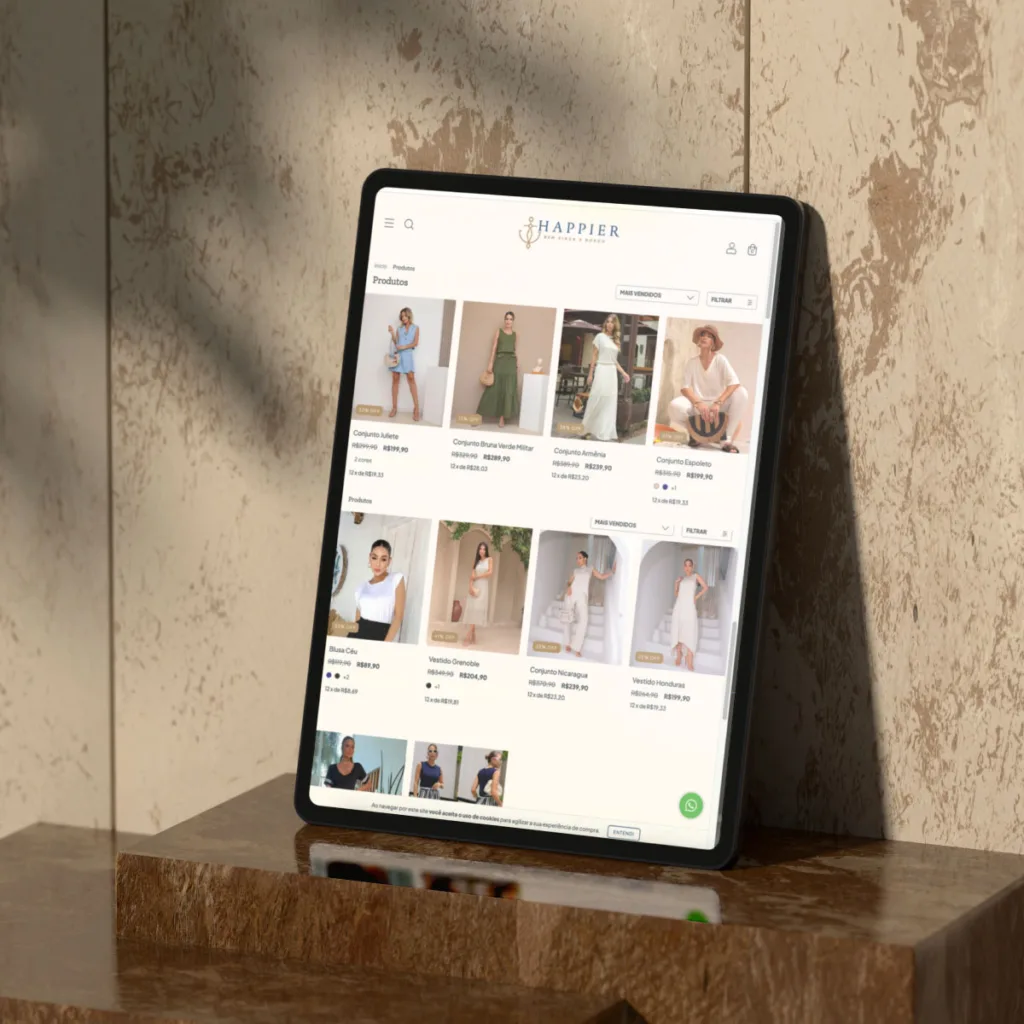 Desarrollamos una tienda online para Happier, una marca de moda femenina que fusiona el estilo náutico con la comodidad y la elegancia. El objetivo principal era transmitir, por medio do design e da experiência de navegação, toda a essência da marca: frescura, autenticidade, sofisticação e conexão com o mar.